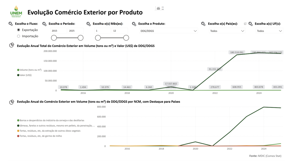 Entre junho de 2023 e agosto de 2025, a Unem e a ApexBrasil mantiveram o primeiro convênio para promoção do DDG/DDGS no mercado internacional, com foco na crescente produção no país e na demanda de outros países por produtos de nutrição animal que tenham origem sustentável, como são os farelos brasileiros. O convênio teve a duração de dois anos e incluiu ações como missões prospectivas e comerciais, branding e criação de marca para o produto, feiras setoriais e projetos imagem.